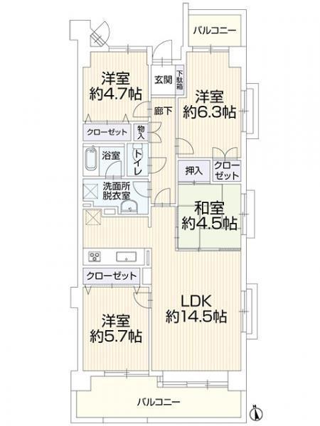4LDK LDK 14.5帖 / 洋 6.3帖 / 洋 5.7帖 / 洋 4.7帖 / 和 4.5帖