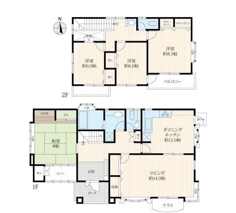 4LDK 1F LDK 18.0帖 / 1F 和 8.0帖 / 2F 洋 8.3帖 / 2F 洋 6.0帖 / 2F 洋 6.0帖